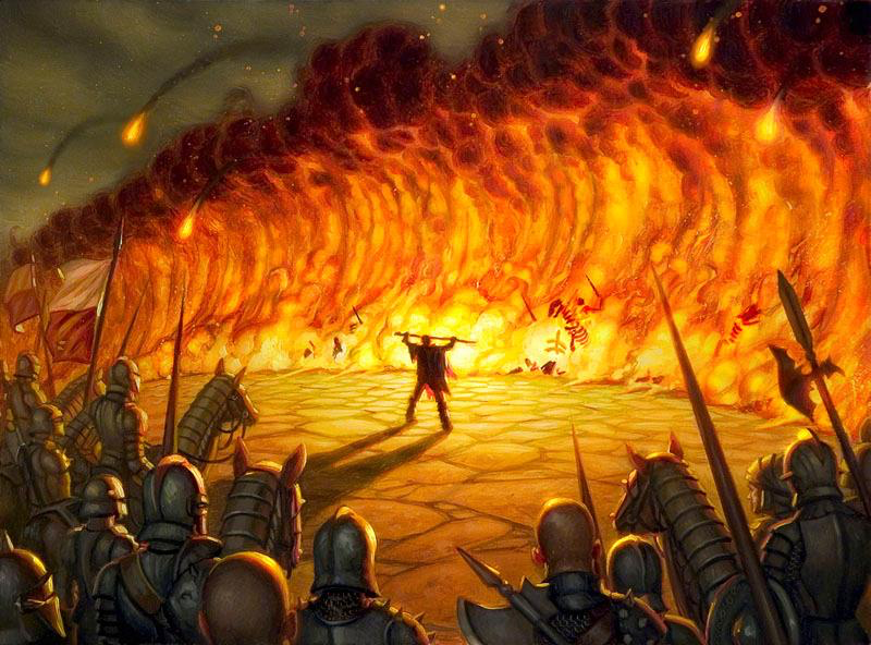 Aussi appelée “Barricade de Feu” ou “Tour de Feu” , ce sort à pour but de gêner, effrayer ou tuer quiconque s’approche de trop près de cette rune a 3 mot. Celle-ci produisant des Flammes physique et non Magique à haute intensité , il est donc impossible de passer ou s’en approcher sans mourir carbonisé